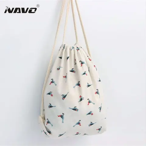 Bird Pattern Printing Drawstring Backpack Cute Fabric Shopping Tote Cotton Linen draw string bags back bag women