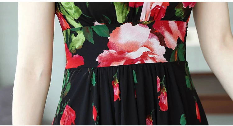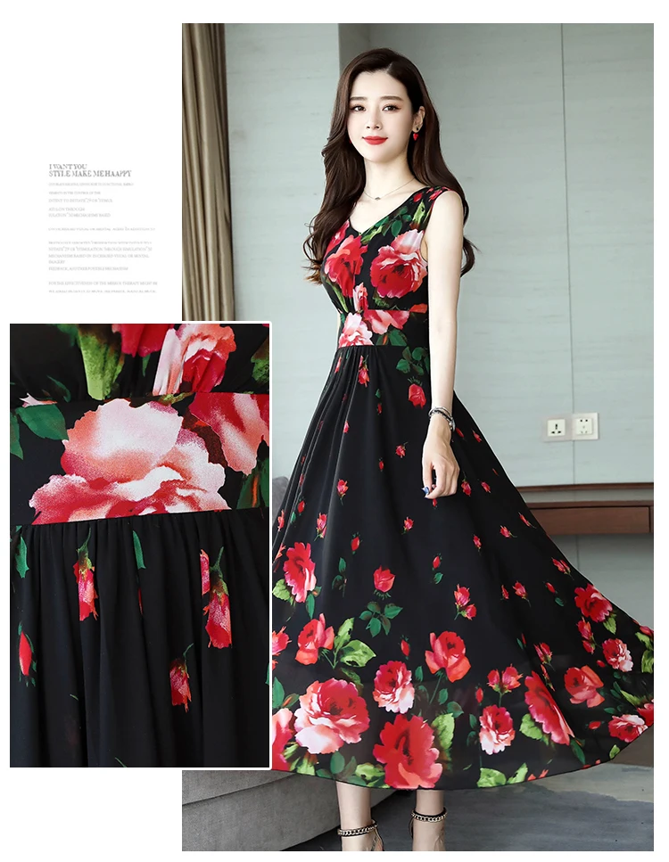 2020 summer new printed chiffon Dress sleeveless waist V-neck was thin Print Big swing dress