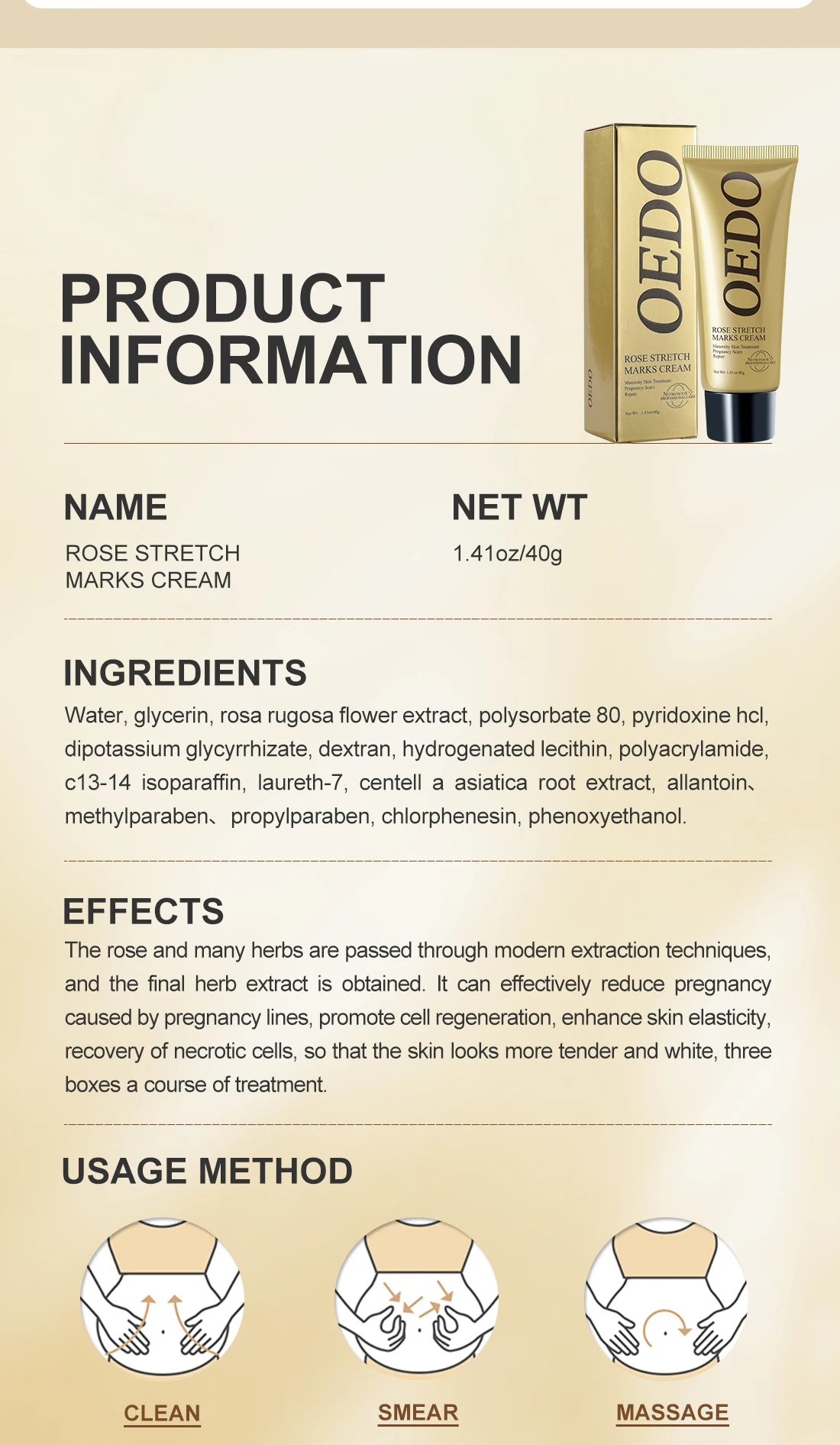Roses and numerous herbs are passed through modern extraction techniques Finally get the herbal extract. It can effectively help reduce stretch marks caused by pregnancy, promote cell.regeneration, enhance skin elasticity, restore necrotic cells,stretch marks, obesity lines, etc.so that the skin looks more tender and white. Three boxes of a course of treatment.