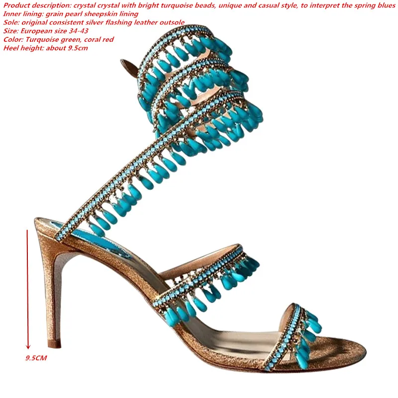 Autumn French snakelike winding tassel high heel shoes turquoise thin heel European and American sandals women
