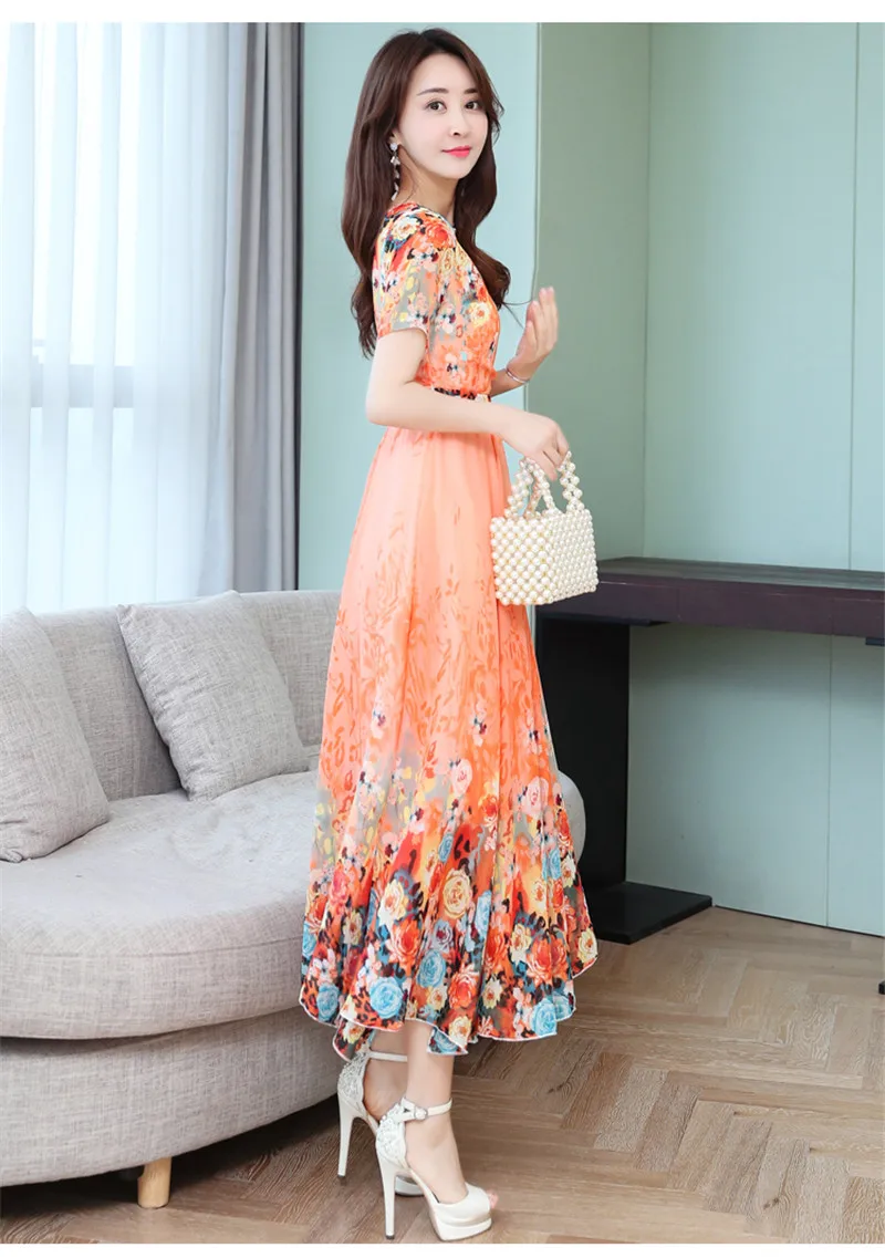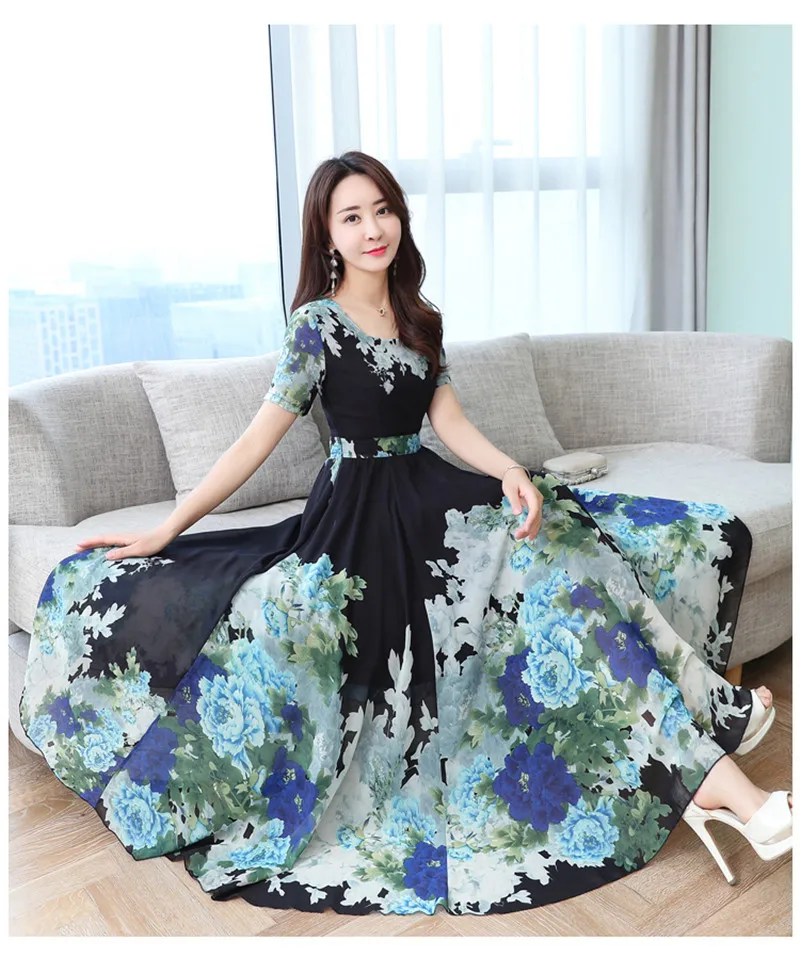 Chiffon dress 2020 Korean new style o-neck short-sleeved chiffon printed long Slim was thin and big swing beach dress