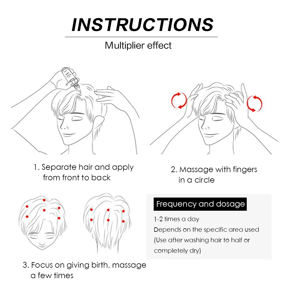 Twice a day, in order to achieve the best results, please use 1 milliliter spray about 4 -5 spray), directly used in the less hair, no hair part of the scalp, help hair growth; increase the number of use or use can not bring better use effect; according to the instructions, each bottle can be used for at least 25-30 days, can effectively reduce hair loss and hair loss.