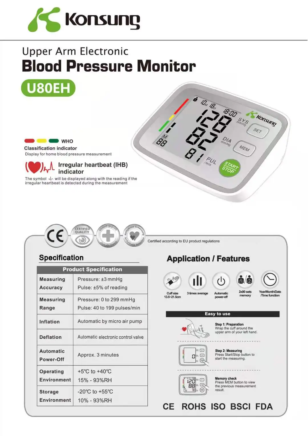 —This upper arm blood pressure monitor’s cuff inflates and deflates automatically to make sure you get more accurate measurements, avoid inconvenience by incorrect inflation, and cut down the measurement time.